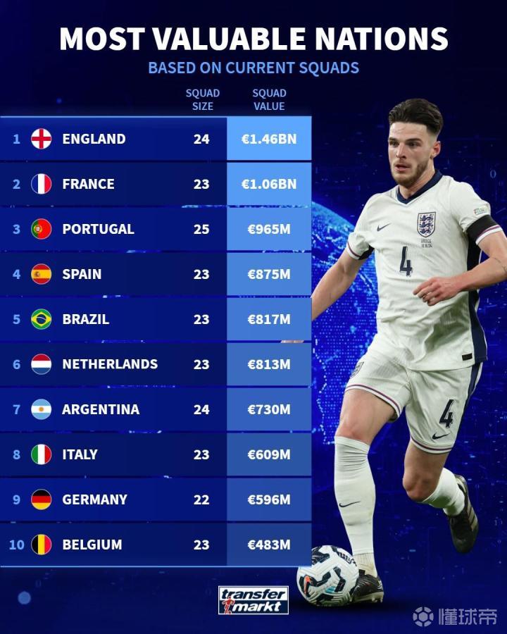 近日,德国转会市场网站公布了最新一期国家队身价排行榜,引起了广泛关注。根据数据显示,英格兰队以惊人的14.6亿欧元身价排名第一,这在一定程度上反映了英格兰队在球员市场上的影响力和实力。