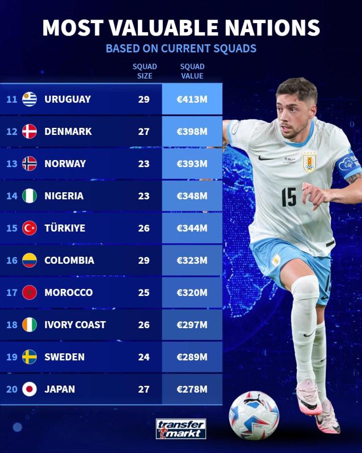 西班牙队以8.75亿欧元身价位列第四,紧随其后的则是巴西队,身价高达8.17亿欧元。值得一提的是,荷兰队以8.13亿欧元身价位列第六,居然超过了传统强队阿根廷。